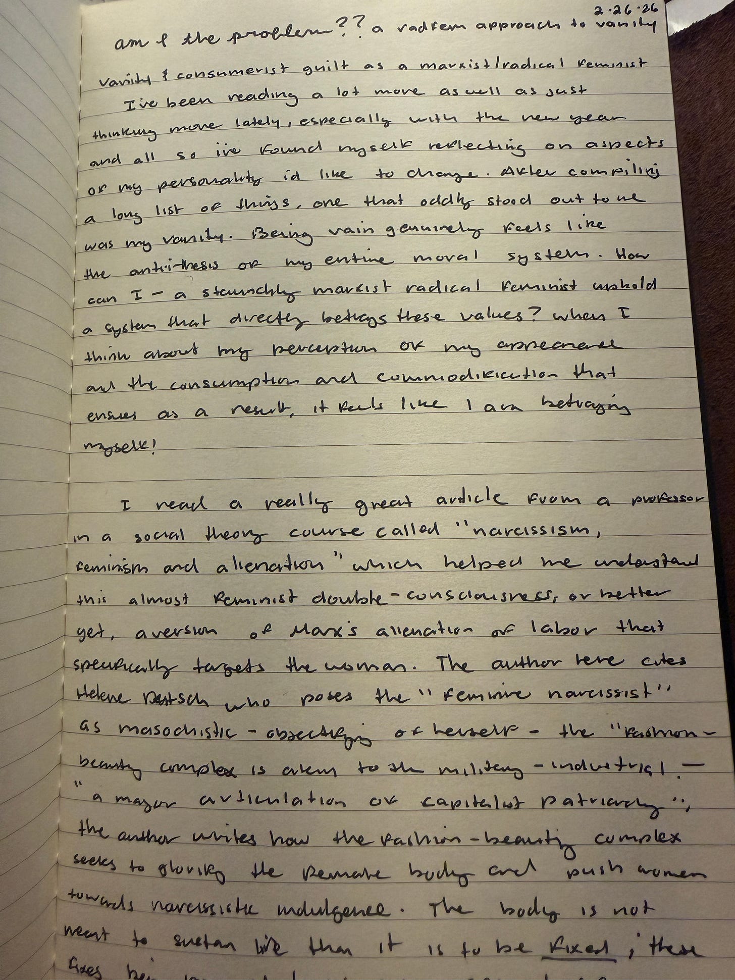 I stumbled upon an article from Sandra Lee Bartky called “Narcissism, Feminism and Alienation” which helped me understand this sort of feminist double-consciousness, or better yet, perversion of Marx’s alienation of labor that specifically targets the woman. Bartky argues that the “fashion-beauty complex” glorifies the female body while pushing women toward narcissistic indulgence. It produces “false needs” through psychological manipulation, creating anxieties about the body that are then answered with products offered as a “sacramental” cure. With this, the body is not meant to sustain life, it is to be fixed or altered, the female body is a task or an object “in need of transformation.” I exist as my body, yet am forced to stand at a distance from it in a “permanent posture of disapproval,” viewing myself through the eyes of what Bartky calls a “cold male connoisseur.” Bartky poses feminine vanity as the internalization of being an object as women take erotic satisfaction in our own “thing-hood” because we see ourselves as subjects, creating a fragmentation of the self where our consciousness is inhabited by internal witnesses who are representatives of a system (capitalist patriarchy) that is hostile to us.